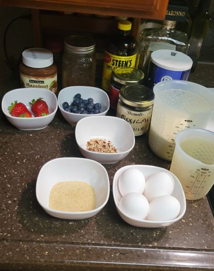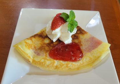 John’s grandmother always made crepes, never pancakes. She would spread them with butter and a little sugar and roll them. This is an excellent way of eating crepes and it always brings memories for John. This month we are taking them up a notch with jam or jelly, whipped cream and berries and syrup. Anything you like is acceptable with crepes. Use your imagination.
