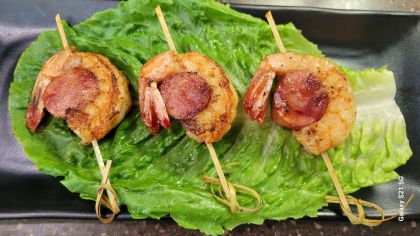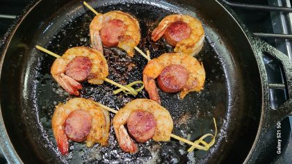 Cut andouille in approx 1/2” rounds. Should be the same size as the width of shrimp.